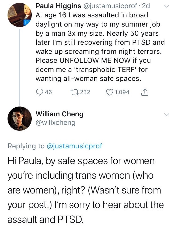 “I’m sorry to hear about the assault and PTSD.”